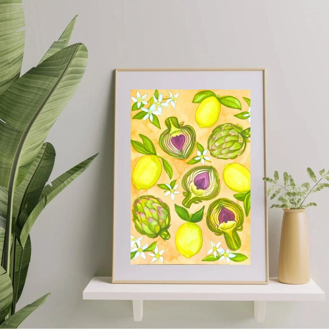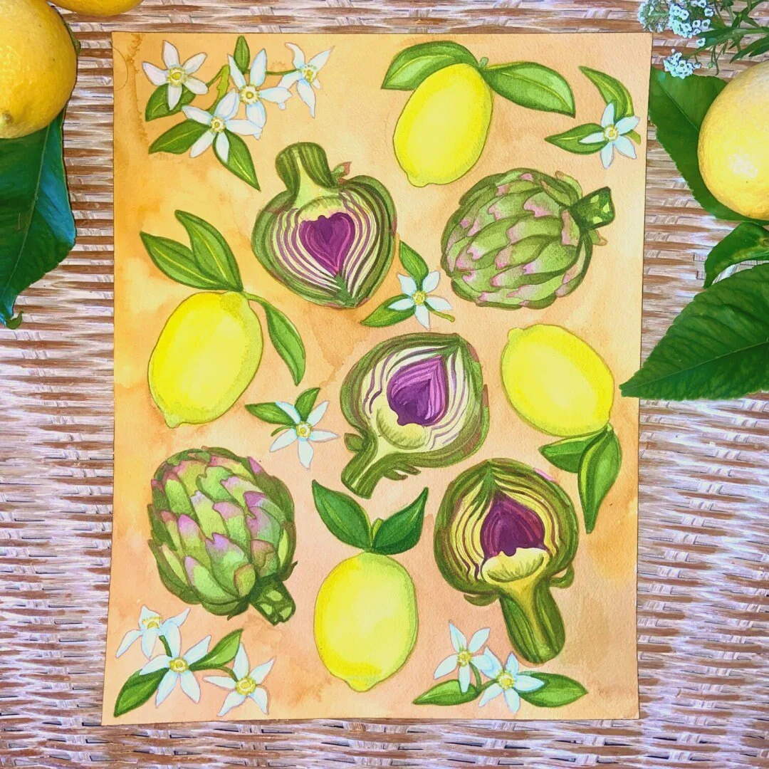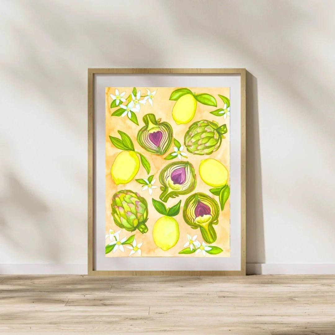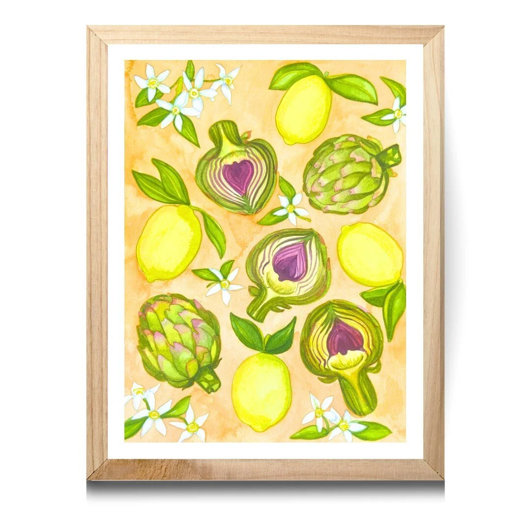Artichokes, Lemons, and Blooms Watercolor Fine Art Giclee Prints and Original