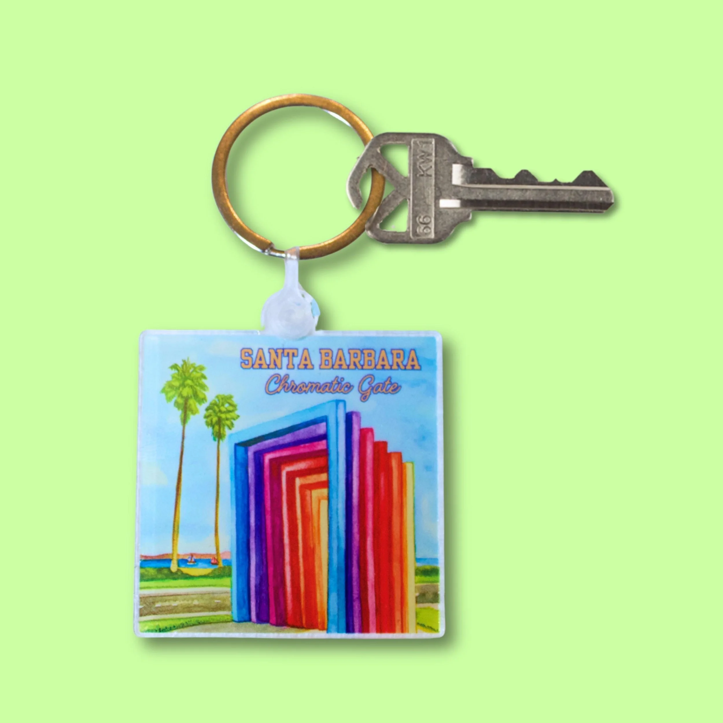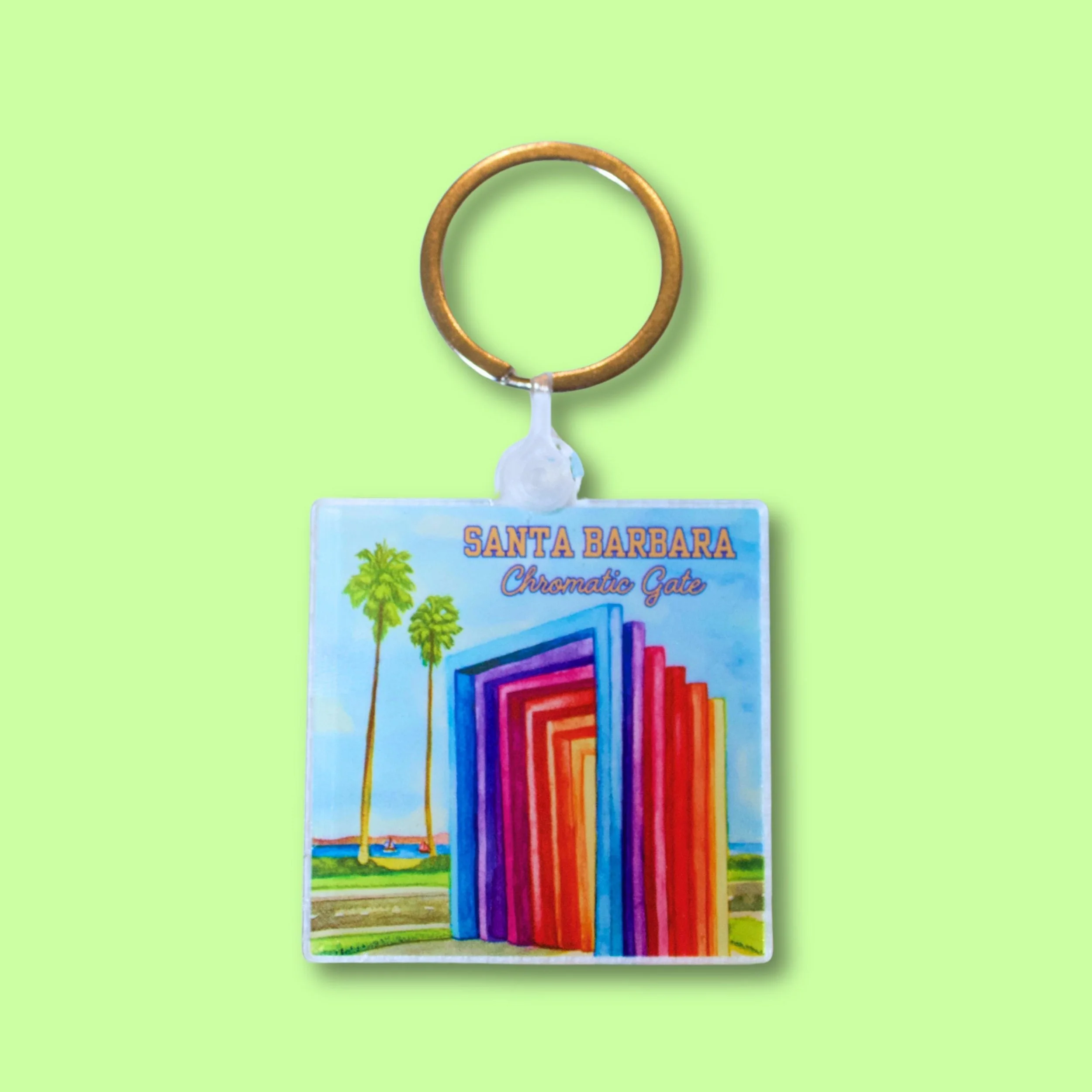 A keychain with one of my original designs of the Santa Barbara Chromatic Gate is printed onto an acrylic 2"x2" square and includes a silver tone ring to attach to your keys, backpack, purse, etc!