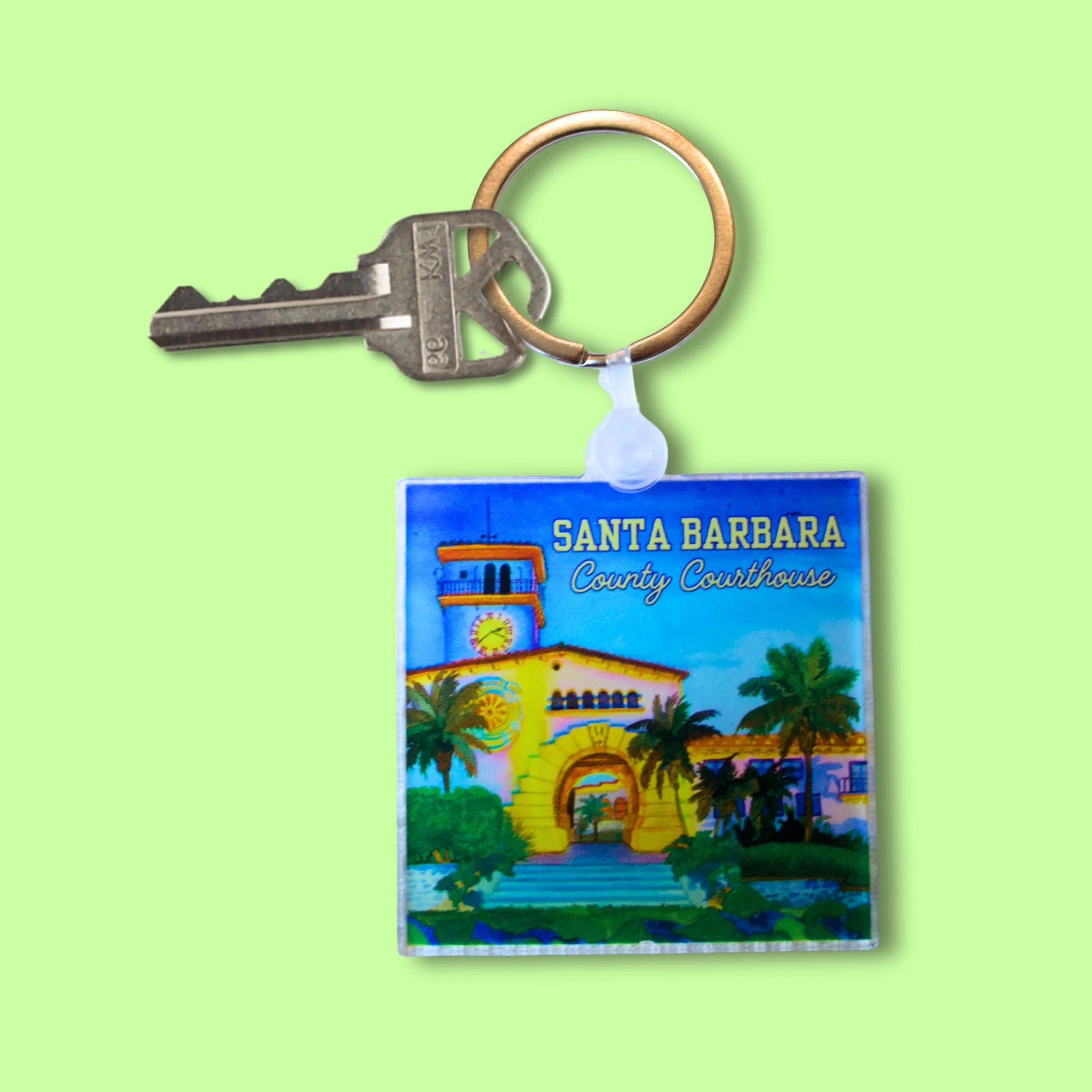 A keychain with one of my original designs of the Santa Barbara County Courthouse is printed onto an acrylic 2"x2" square and includes a silver tone ring to attach to your keys, backpack, purse, etc!